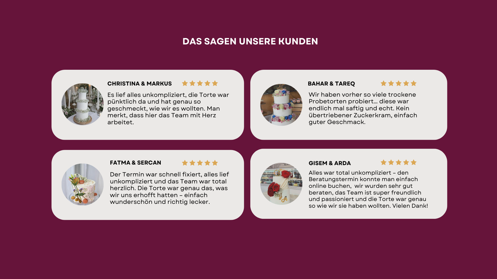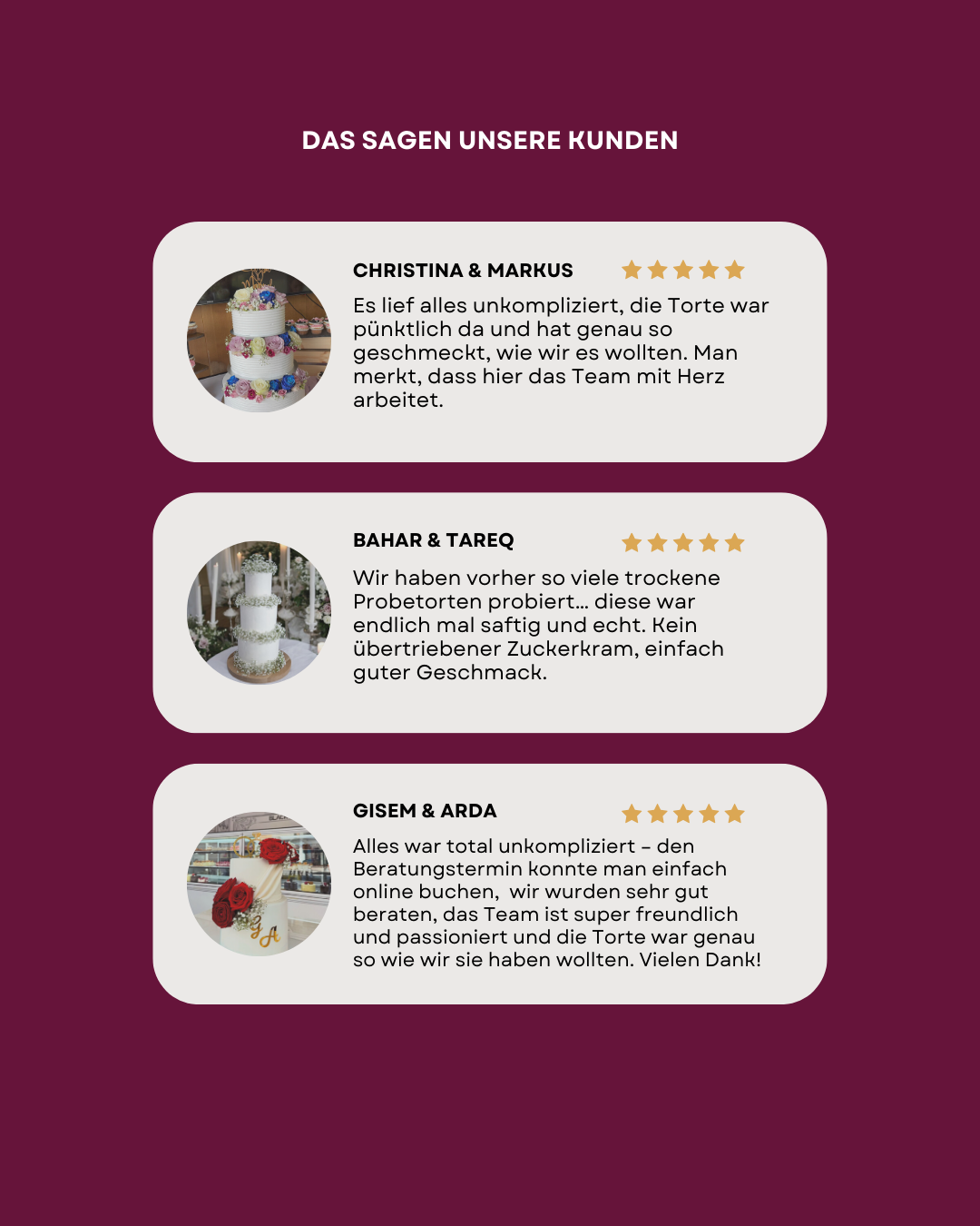 Wir entwickeln jede Kreation so, dass sie euren Tag unterstützt. Geschmacklich vielseitig, bewusst gestaltet und passend zu eure gemeinsamen Geschichte.